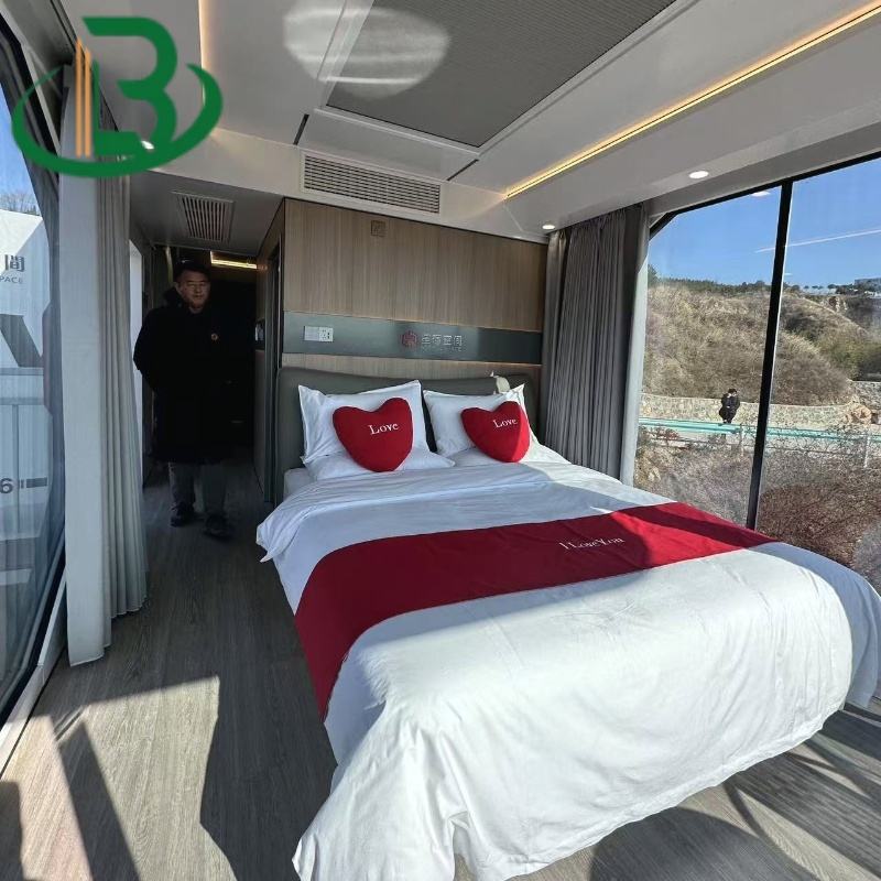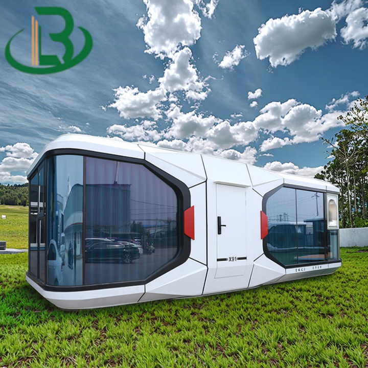 Maison en acier moderne en forme de capsule spatiale, angle de vue panoramique, maison-conteneur, hôtel, villa