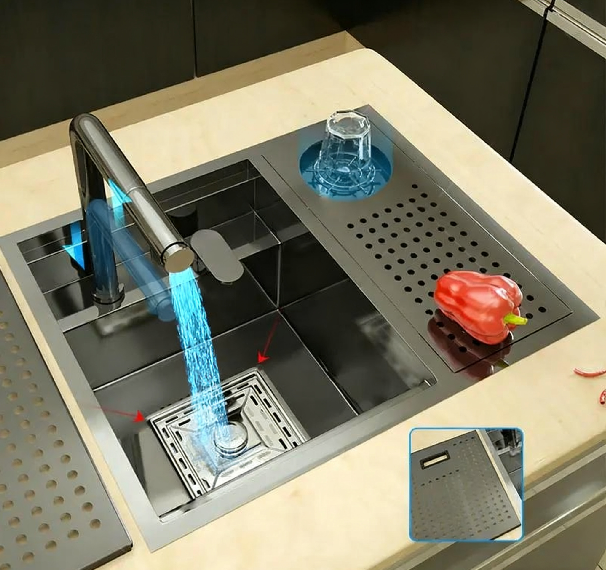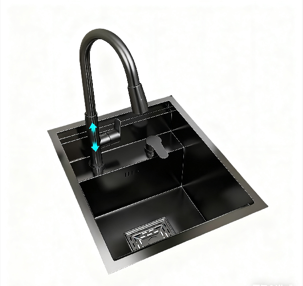 Évier de cuisine noir de bar carré moderne caché en acier inoxydable avec robinet au-dessus du comptoir Conception à cuvette unique