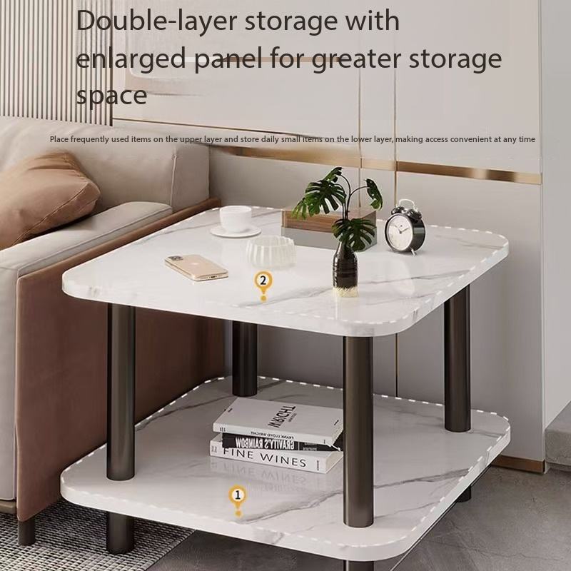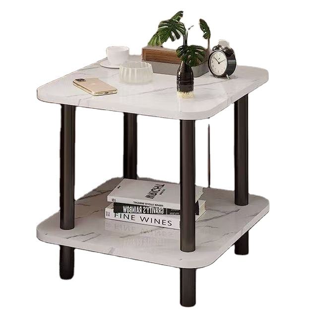 Table d'appoint moderne à motif marbre carré, table à 2 niveaux avec pieds en métal robustes, petite table de chevet pour petits espaces