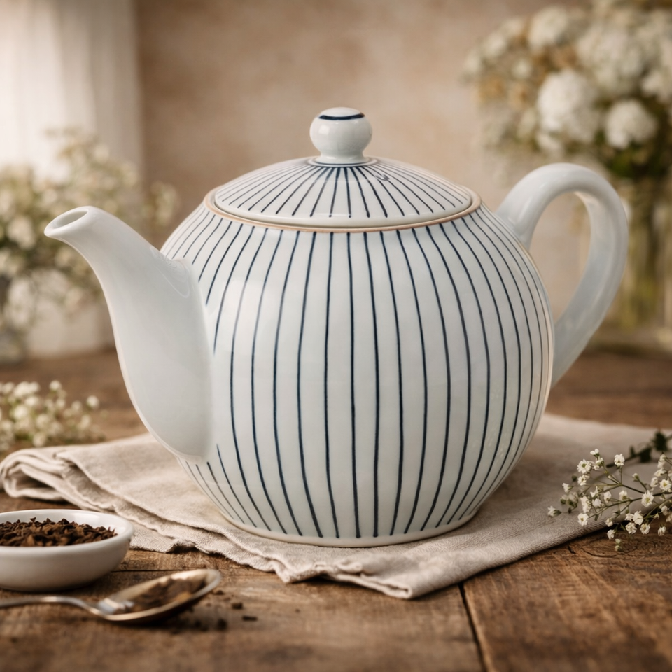 Théière au design rayé moderne avec bec verseur de précision, poignée confortable et corps isotherme, idéale pour servir le thé