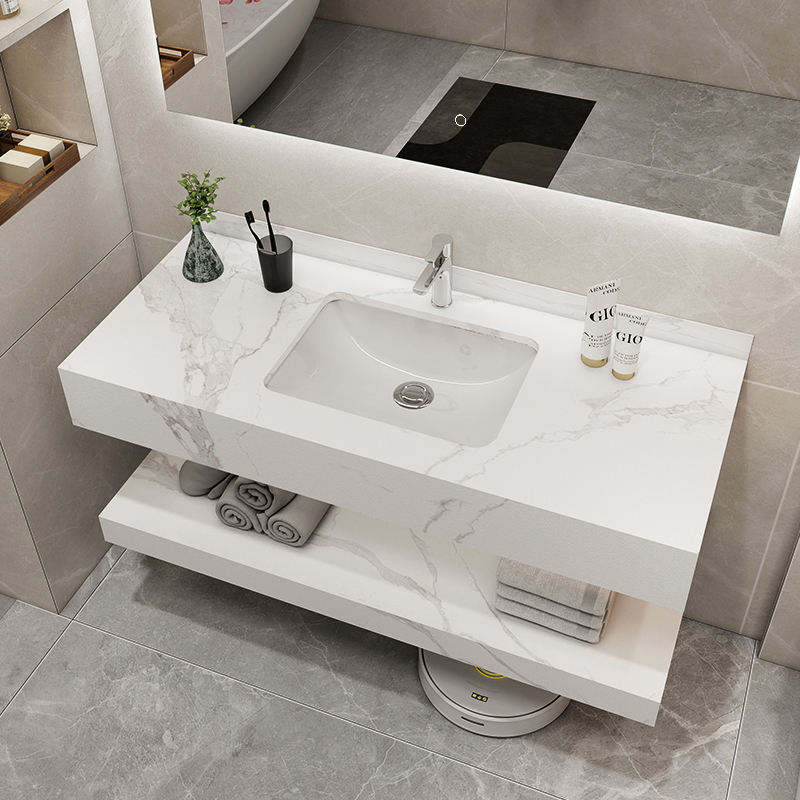 Meuble-lavabo de salle de bain moderne à deux niveaux avec plan en céramique LED intelligent et dessus en marbre, avec dalle de pierre pour la maison