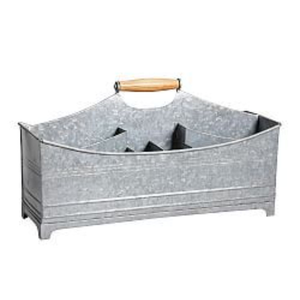 Caddie en métal galvanisé de style moderne avec poignée en bois, porte-ustensiles à 6 compartiments et organiseur de couverts, pour service de table