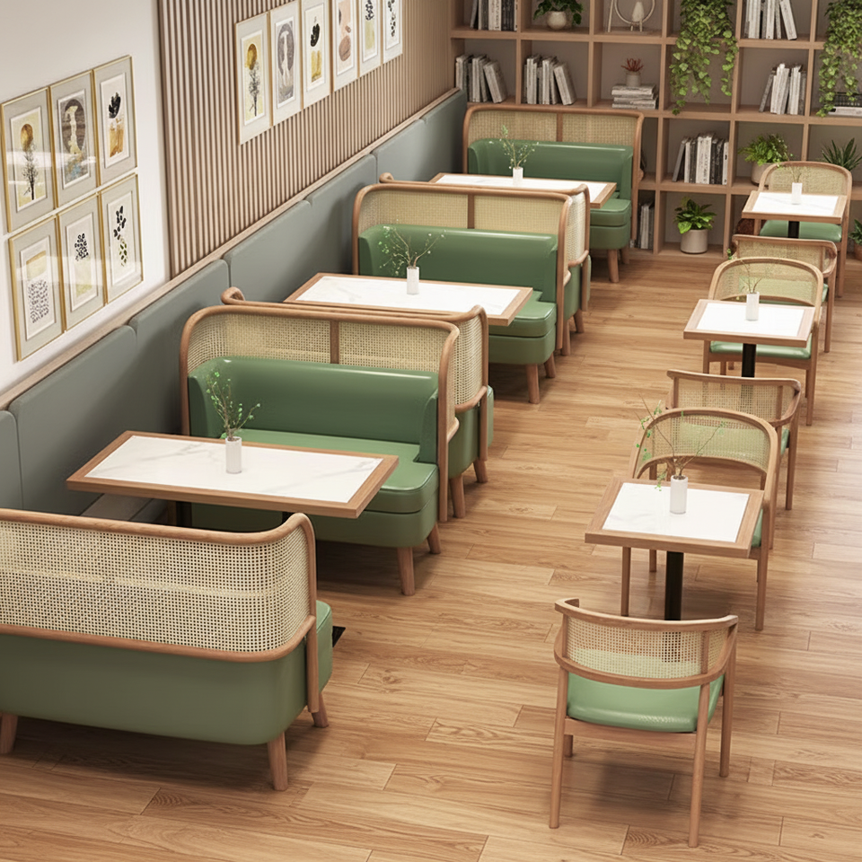 Ensemble de table, chaise, canapé et banquette de style moderne pour hôtel, café, restaurant, en bois massif, usage commercial, facile à nettoyer