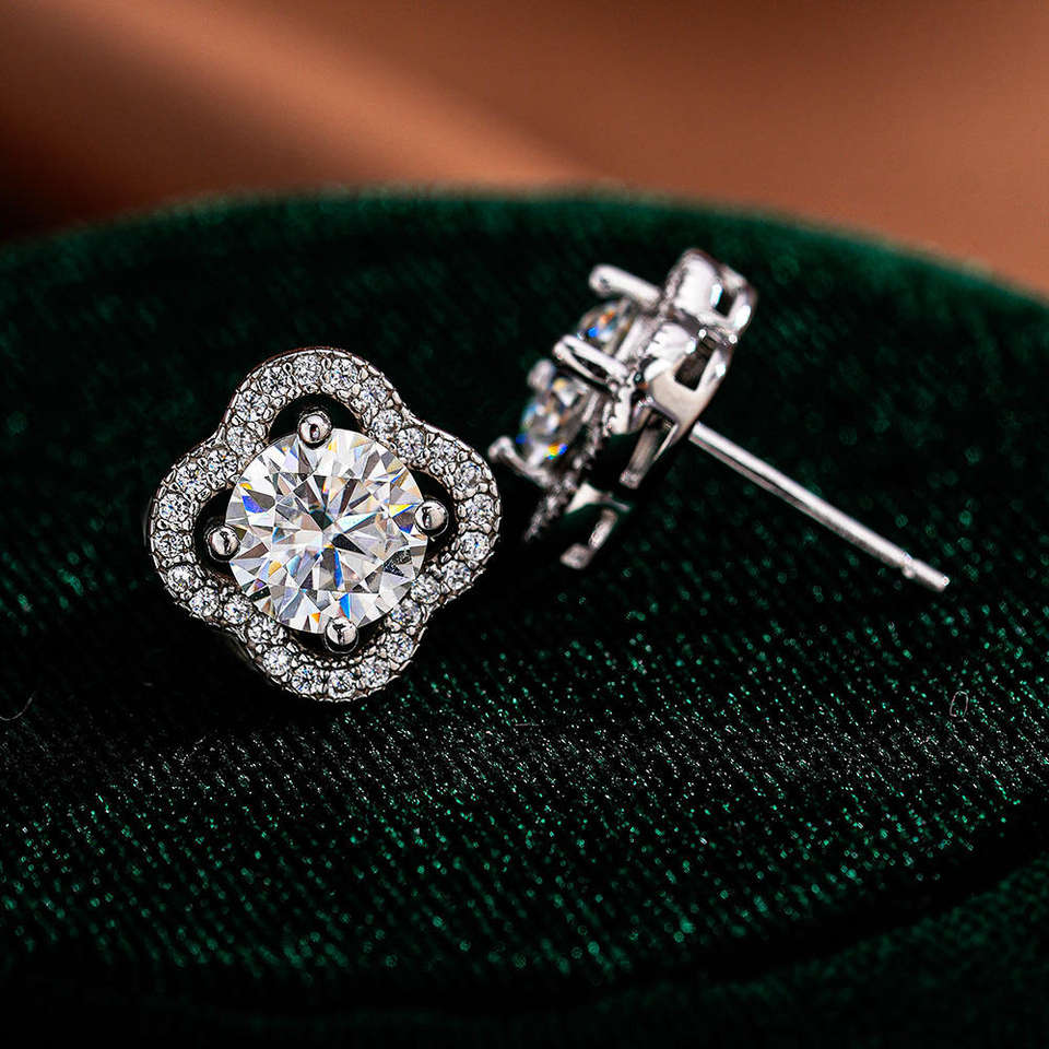 Nom du produit:Boucles d'oreilles puces en or massif 18 carats, motif trèfle avec halo et sertissage en grappe