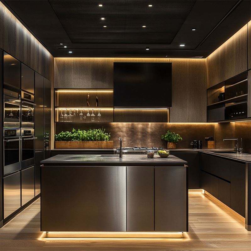 Îlot de cuisine de style moderne avec rangement complet, design personnalisé de luxe, sièges de bar et plan de travail en quartz, structure en acier inoxydable intégrée
