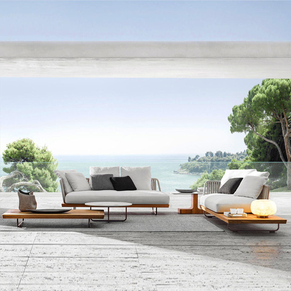 Ensemble de jardin d'extérieur de style moderne, canapé en rotin et en teck pour le loisir, pour villa, véranda ouverte, cour, jardin, 2 places
