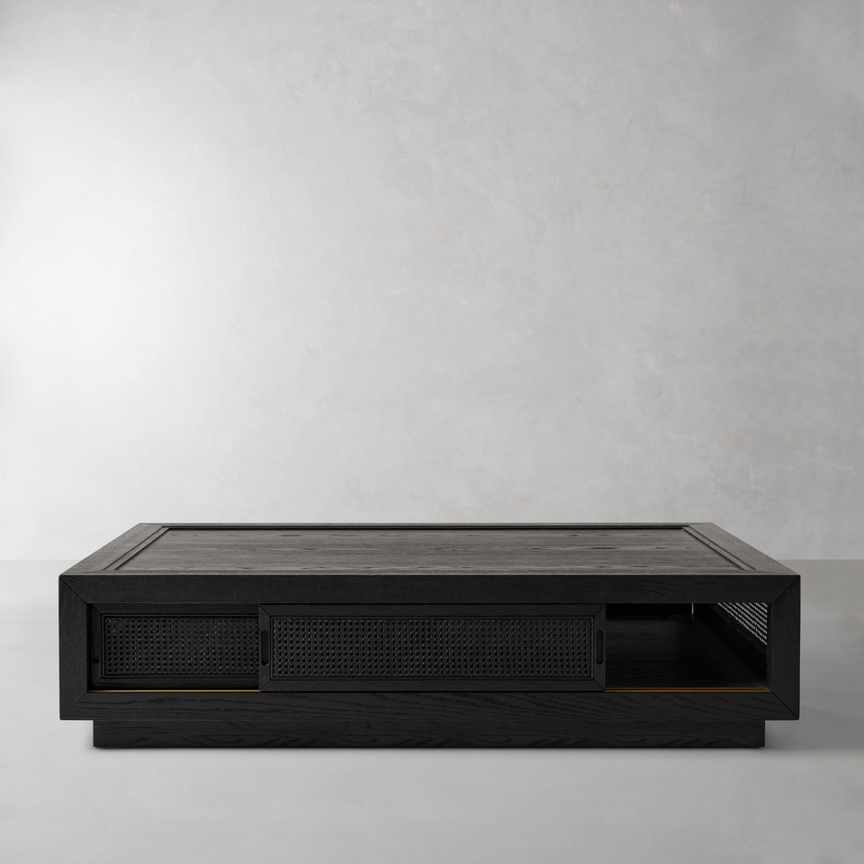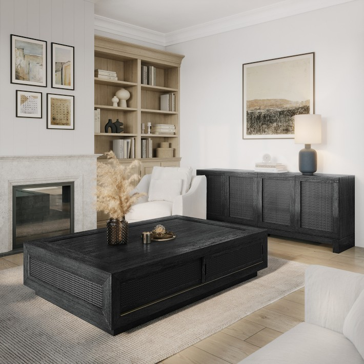 Table basse en bois massif de style moderne avec accents en rotin naturel forme rectangulaire couleur noire pour meubles de salon à la maison