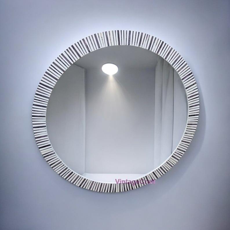 Miroir en verre artisanal écologique, moderne et élégant, bleu et blanc, incrusté de os, décoration d'intérieur, cadre rond, motif abstrait