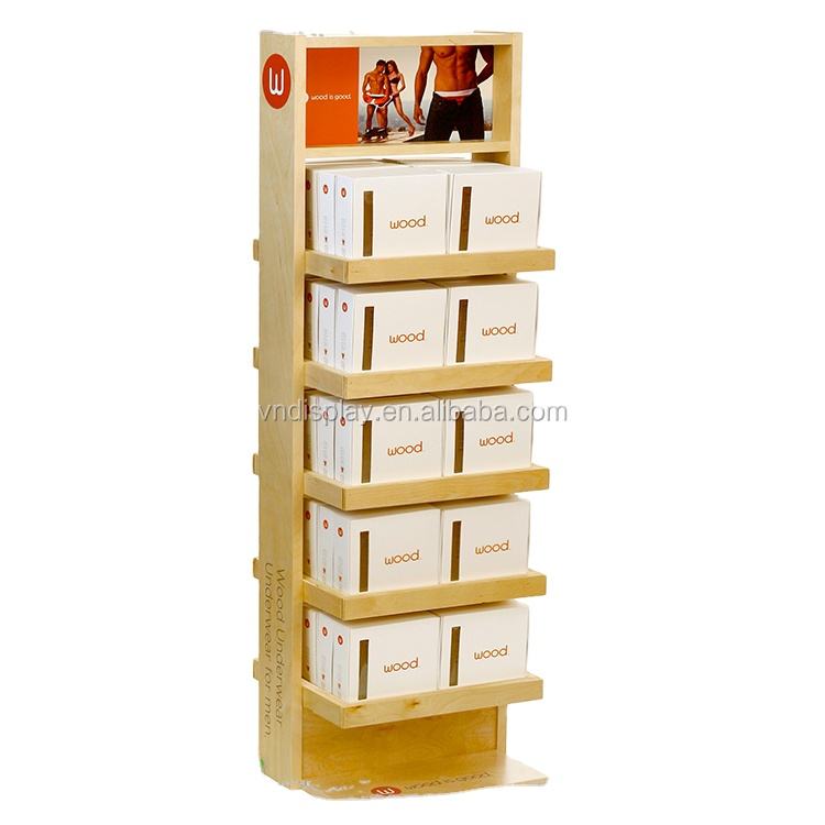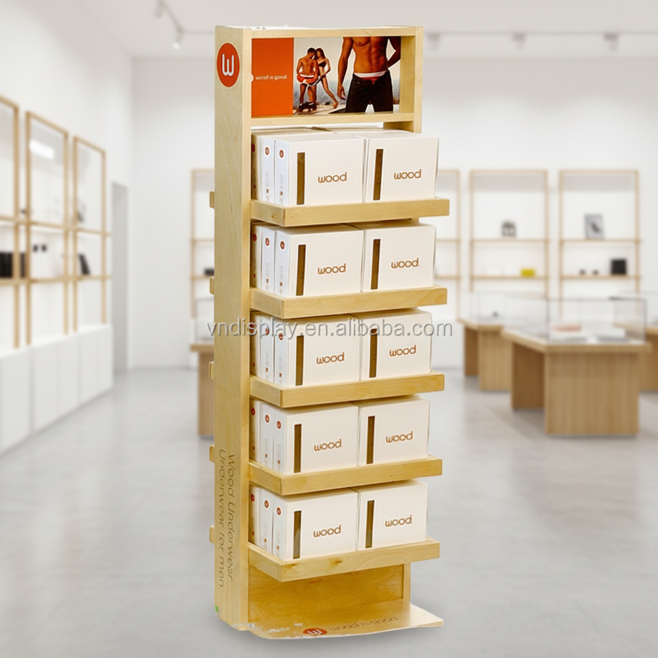 Présentoir en bois pliable moderne et élégant à 5 étagères, personnalisable et lavable, pour l'affichage de marchandises en centre commercial et pour les exportateurs