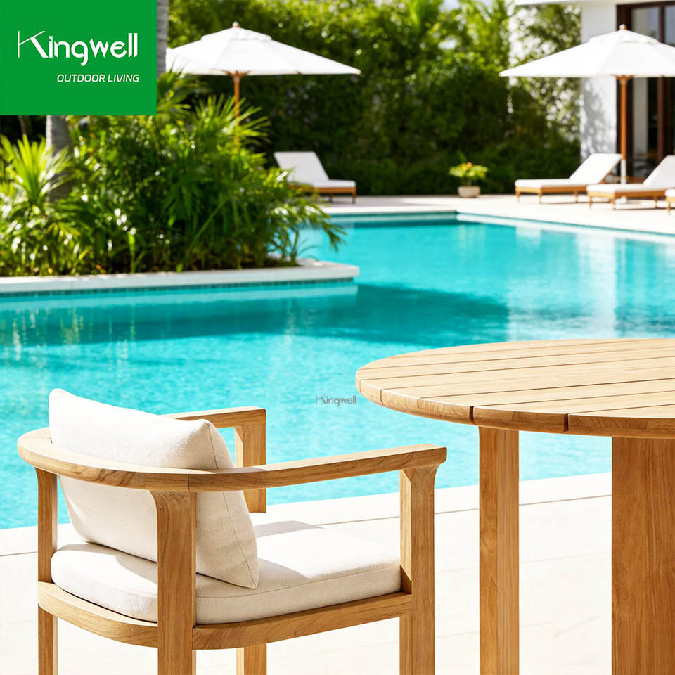 Table et chaises de salle à manger d'extérieur en teck moderne pour patio, parc, hôtel, restaurant, balcon, villas
