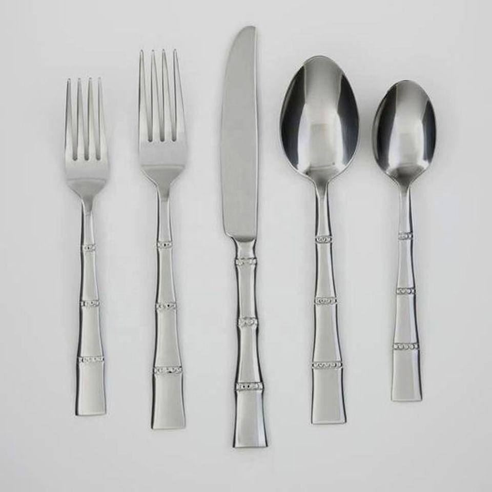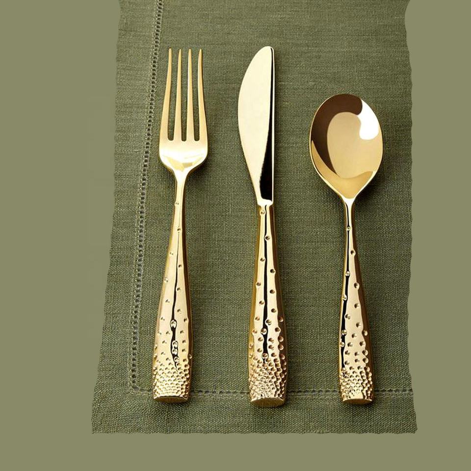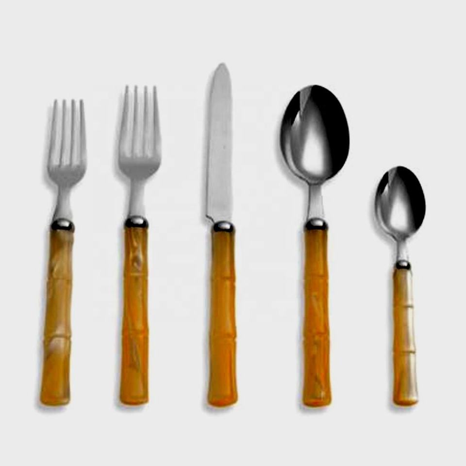 Couverts modernes en acier inoxydable plaqué or avec manche en métal, en bambou fin et cuillère, fourchette, couteau