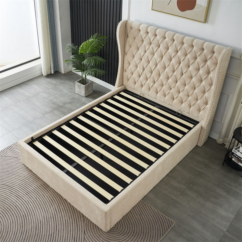 Lit ottoman de rangement Queen en tissu, design moderne et traditionnel, beige crème, avec tête de lit capitonnée et souple, et système de levage à gaz