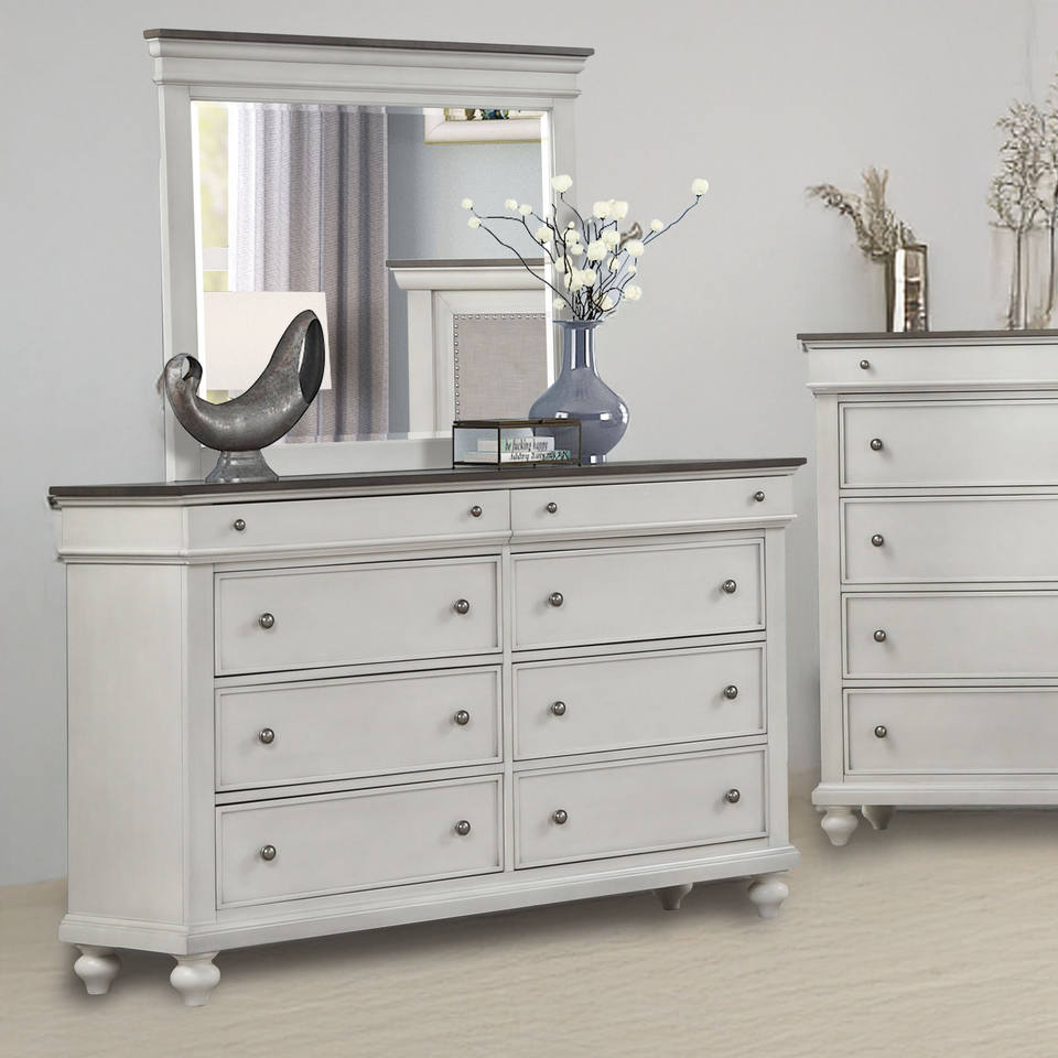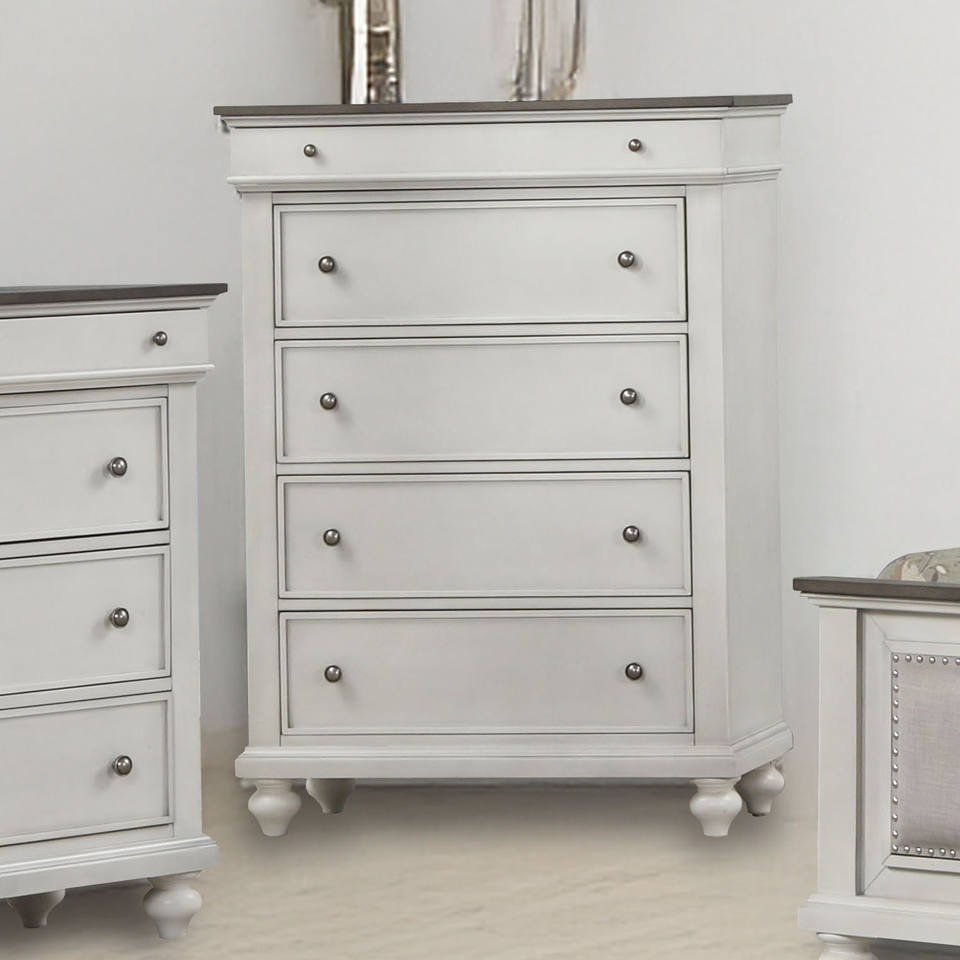 Ensemble de chambre à coucher moderne bicolore blanc - 5 pièces avec lit à panneaux rembourrés, commode, miroir, armoire et table de chevet