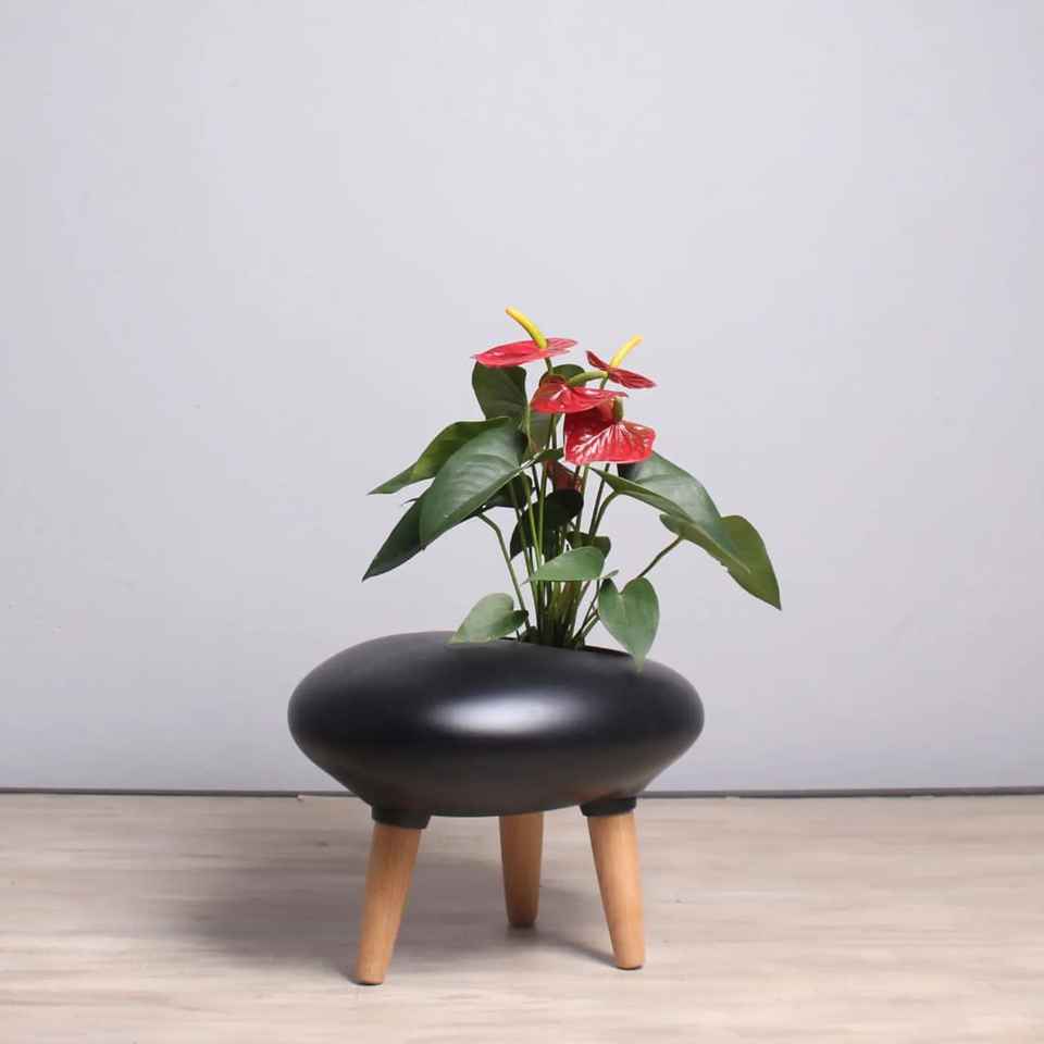 Pot de fleurs en céramique moderne en forme d'OVNI avec pieds en bois, design créatif en galets, support trépied décoratif pour plantes succulentes de bureau