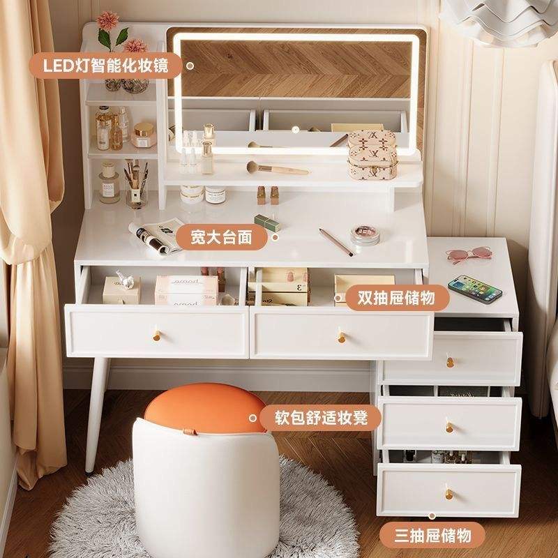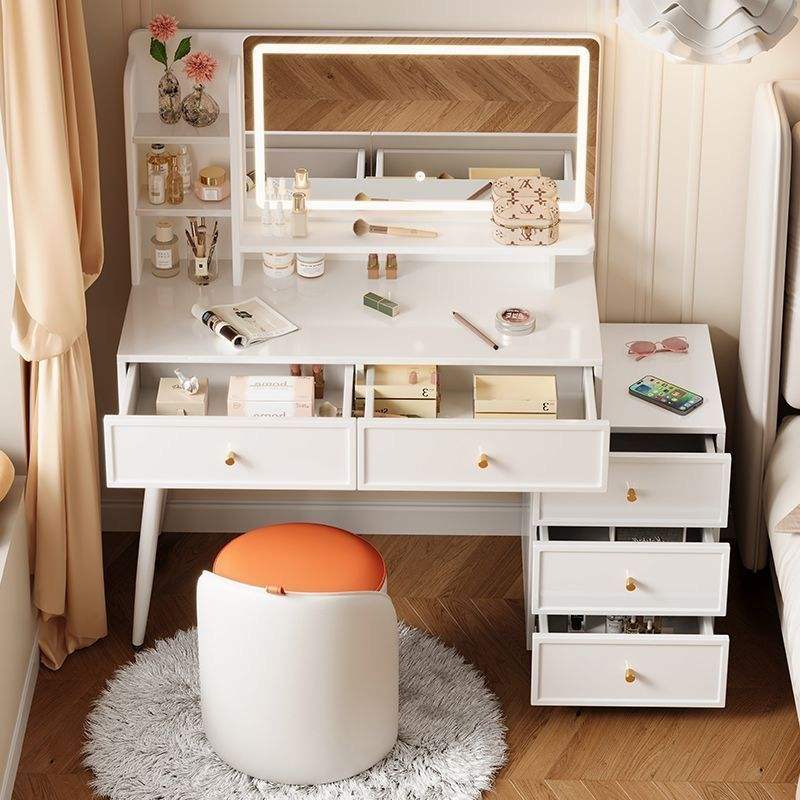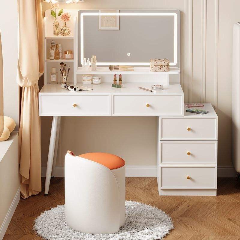 Ensemble de coiffeuse moderne avec miroir LED, table de maquillage blanche avec armoire latérale et tabouret