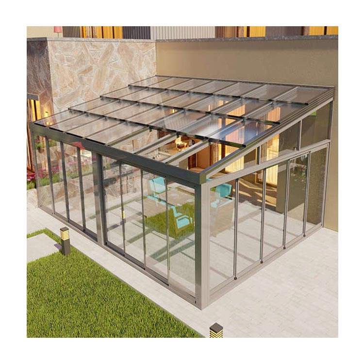 Véranda préfabriquée moderne de style victorien avec structure en alliage d'aluminium et verre trempé, idéale pour usage résidentiel ou hôtelier en extérieur