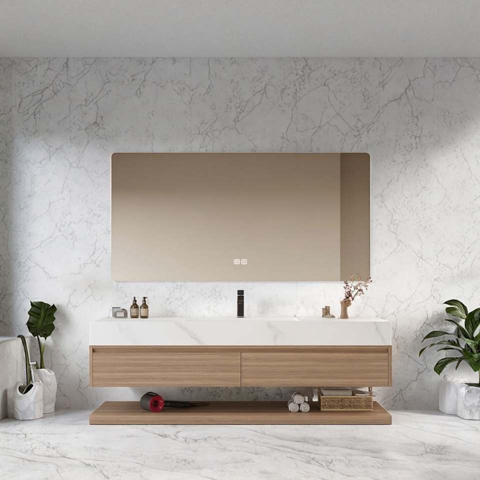 Ensemble de meuble-lavabo mural moderne avec miroir LED, armoire en bois et plateau en marbre