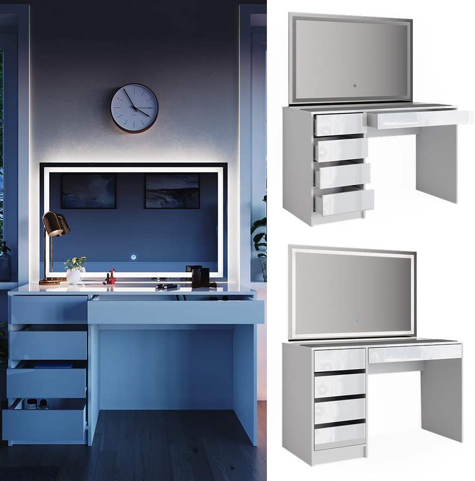 Table de toilette moderne blanche avec miroir LED, tiroirs de rangement, bois, table de maquillage pour chambre à coucher avec miroir éclairé