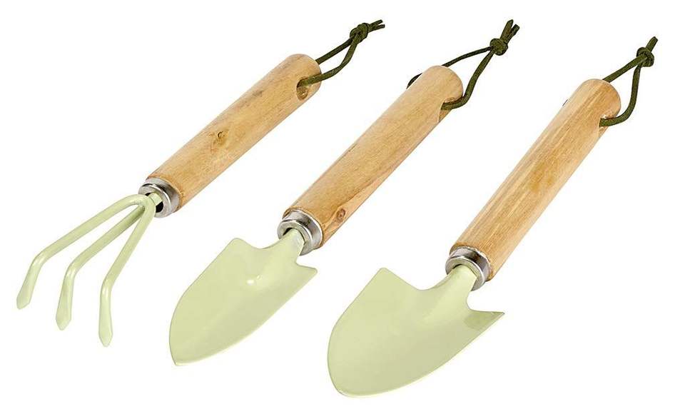 Ensemble d'outils de jardinage blancs modernes avec manche en bois, comprenant une truelle, un râteau et une houe, pour la plantation intérieure et extérieure