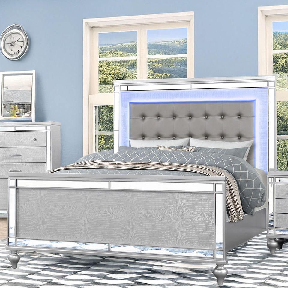 Ensemble de meubles de chambre à coucher modernes blancs à LED - Lit avec tête de lit capitonnée, commode et table de chevet