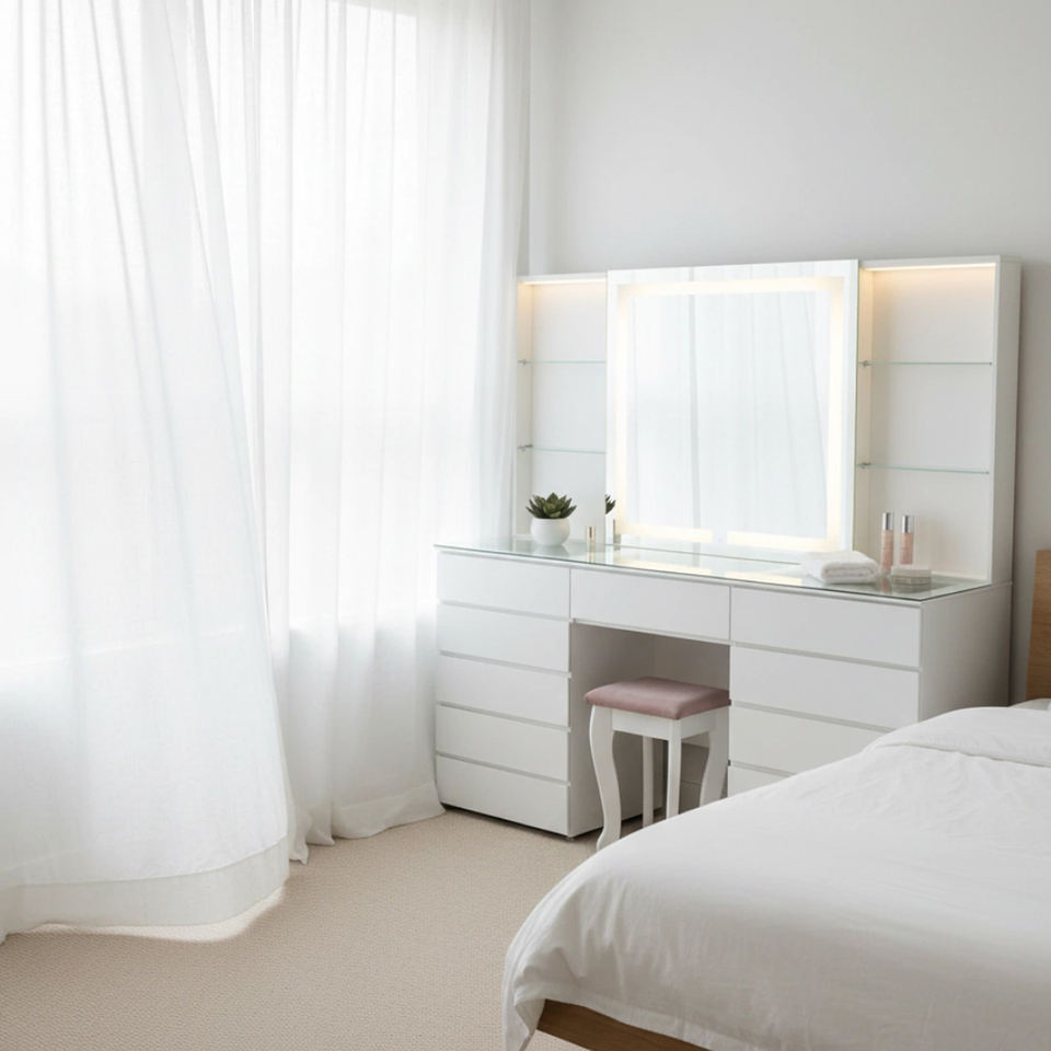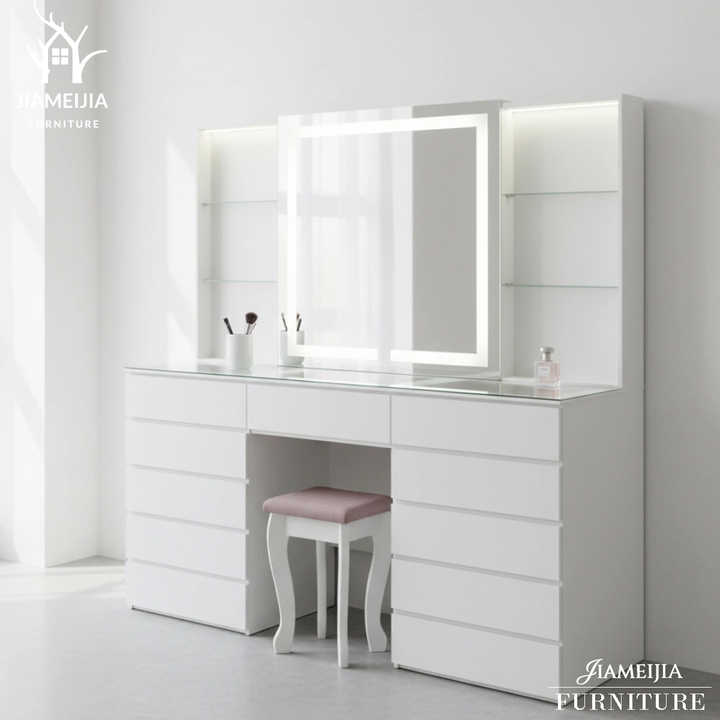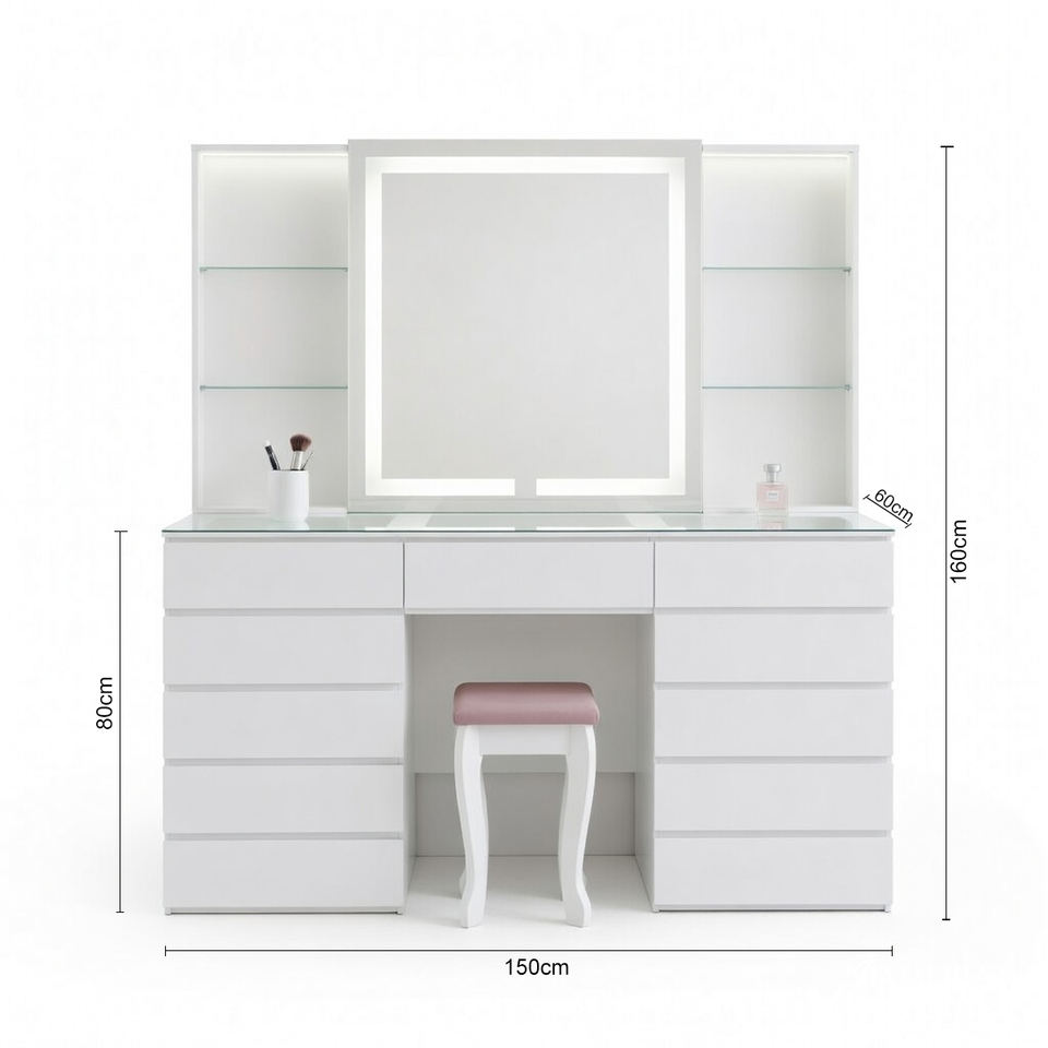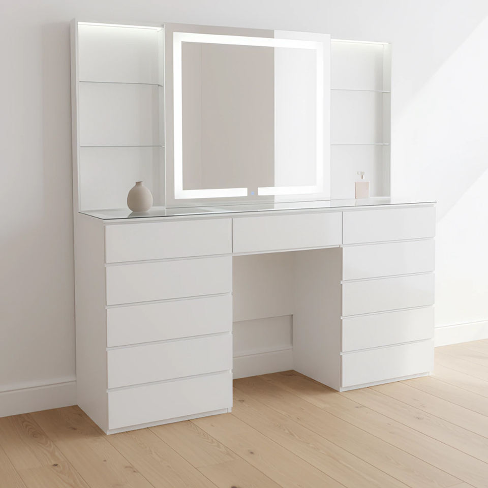 Coiffeuse moderne blanche à LED avec miroir éclairé, 11 tiroirs, plateau en verre, bureau de maquillage, ensemble de meubles de chambre
