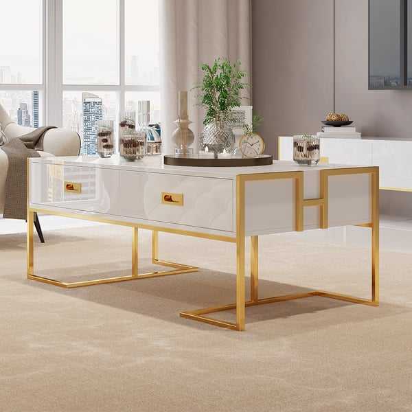 Table basse rectangulaire blanche moderne avec tiroirs, laqué, base dorée