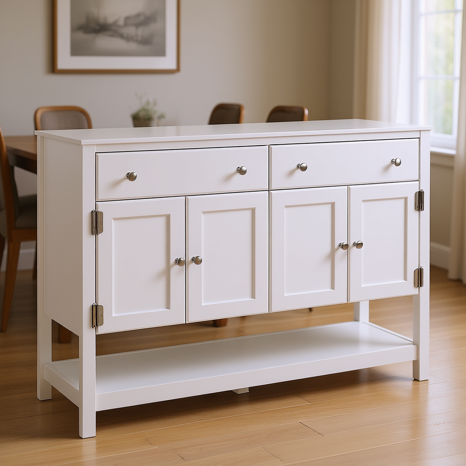 Buffet moderne blanc avec charnières métalliques et poignées rondes pour le rangement dans la salle à manger