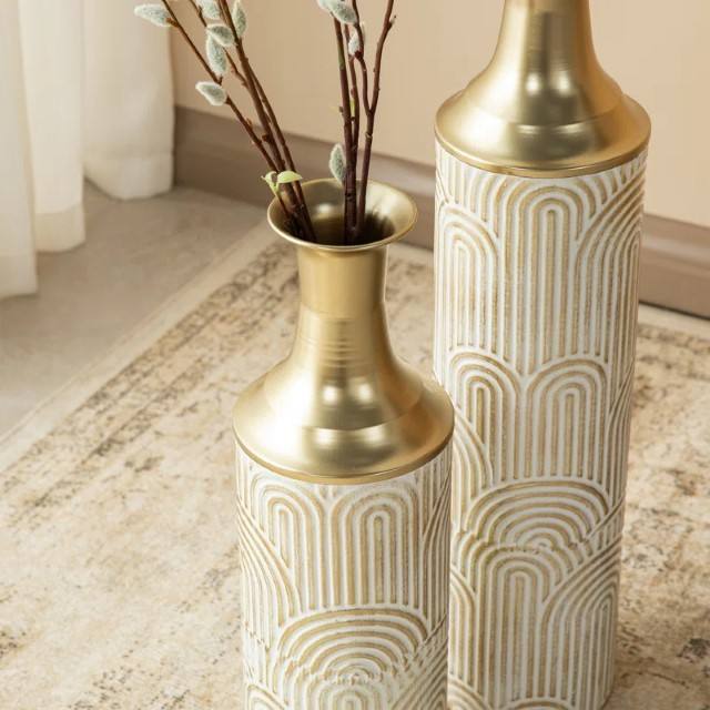 Modern White and Aluminium Gold Metal Floor Vases could be suitable These vases feature a modern design with a white base