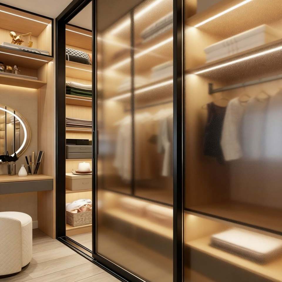 Armoire moderne en bois avec portes coulissantes en verre, éclairage LED et niche de rangement, grande capacité, meubles de rangement pour chambre à coucher