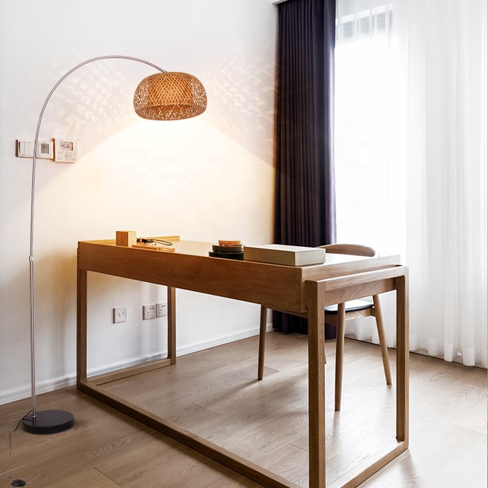 Lampadaire moderne Grand abat-jour en rotin mélangé bambou Lampe sur pied avec ampoule Bambou Hauteur réglable Éclairage au sol pour la maison hôtel