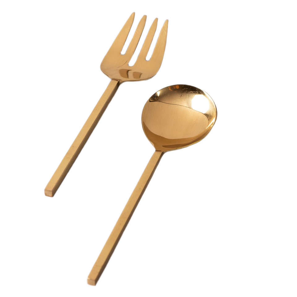 Ensemble cuillère et fourchette de service moderne en or avec poignées carrées et finition polie miroir, idéal pour la cuisine, la salle à manger et la maison
