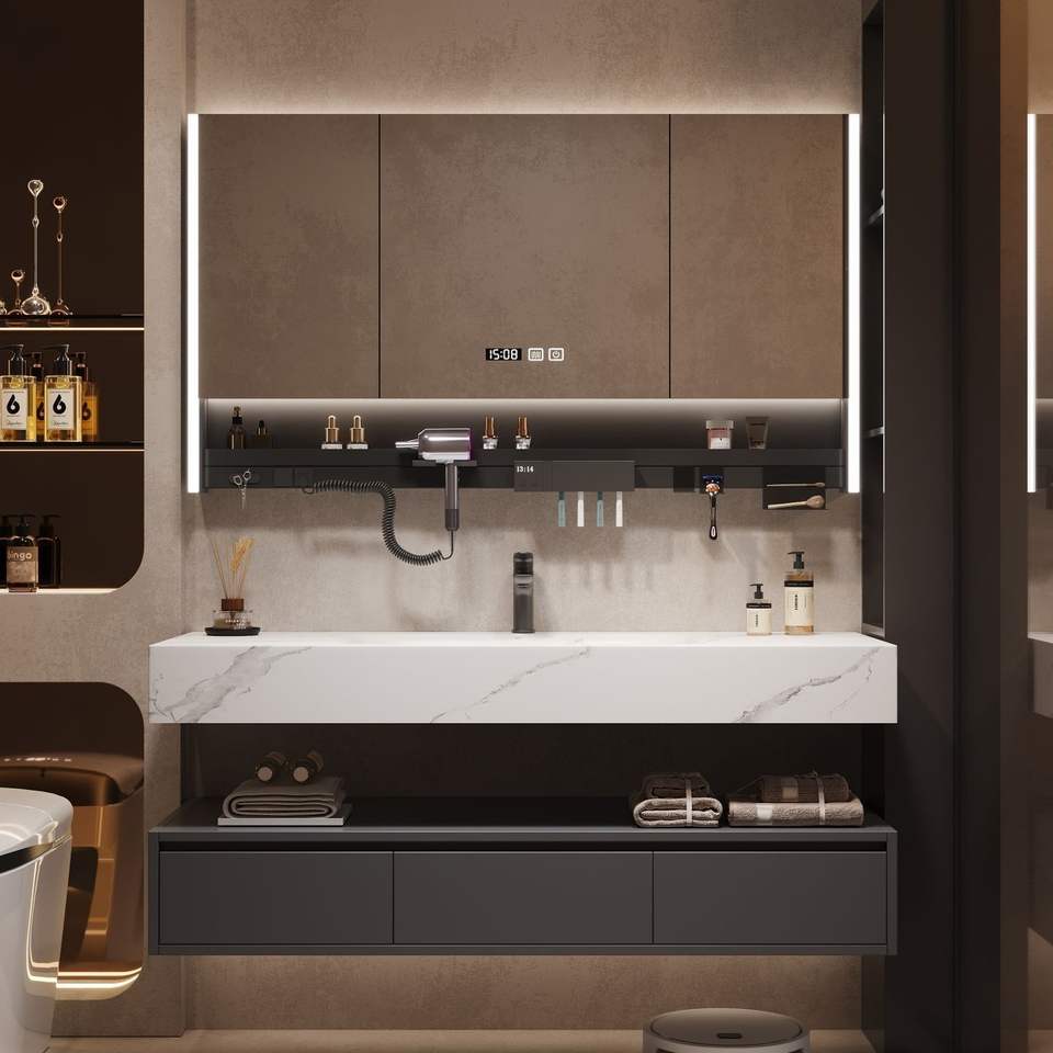 Meuble de salle de bain moderne de luxe léger avec panneau en pierre, vasque en céramique intégrée double couche et armoire miroir intelligente