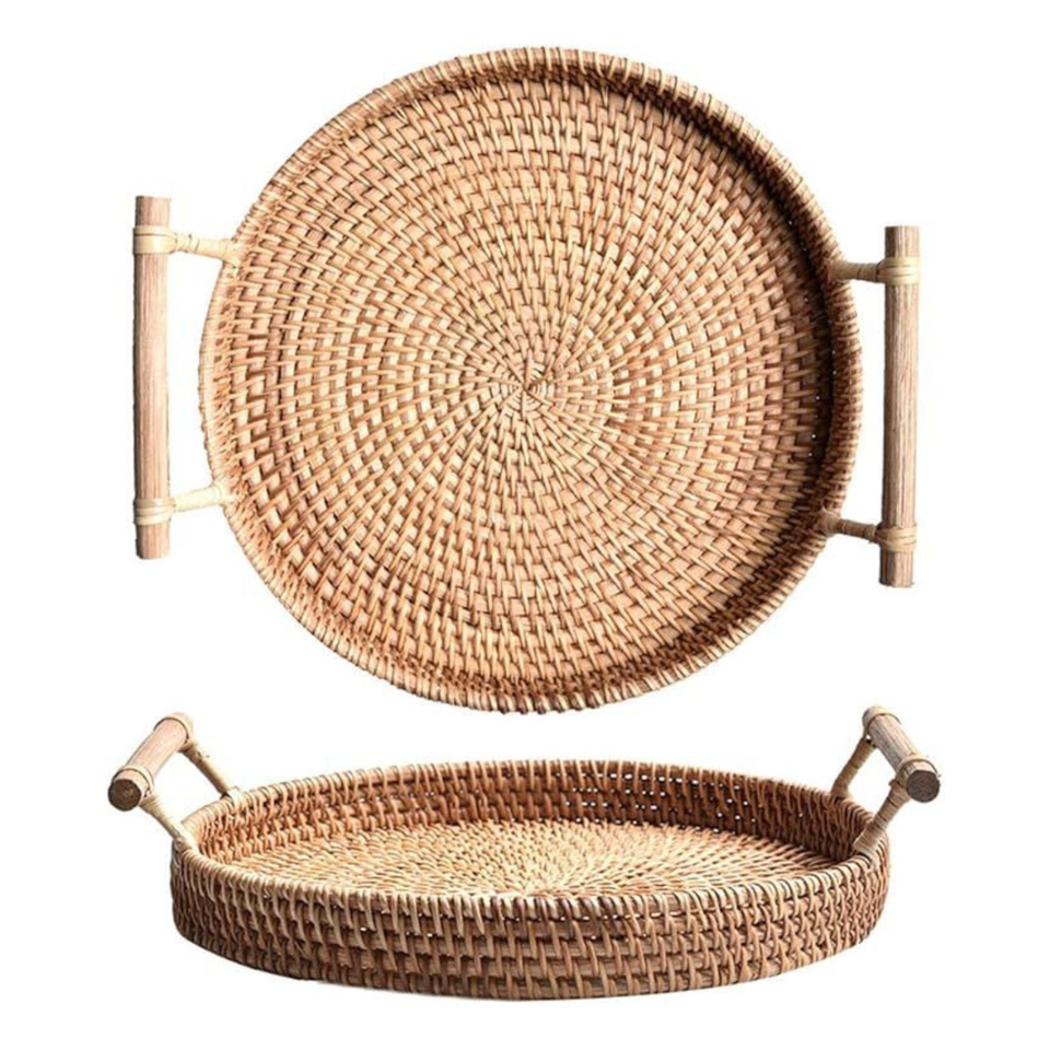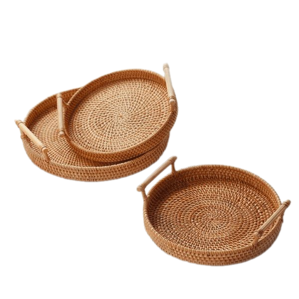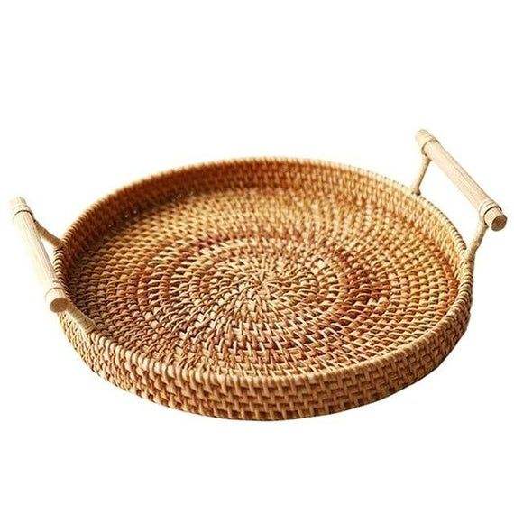Modern Style Natural Rattan Woven Round Serving Basket Bread Tray With Handle Home Dining Table Decoration