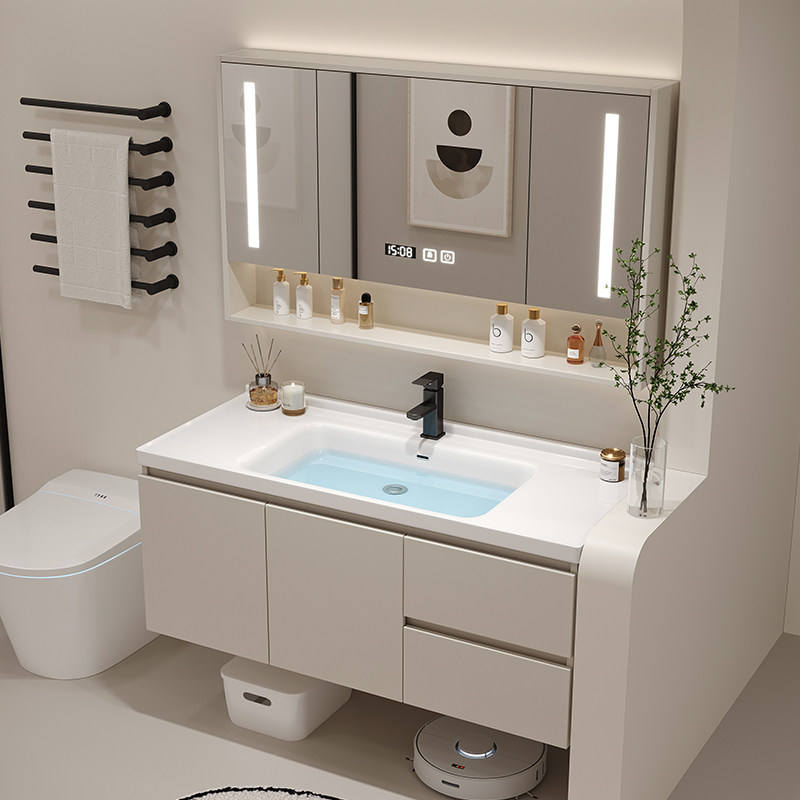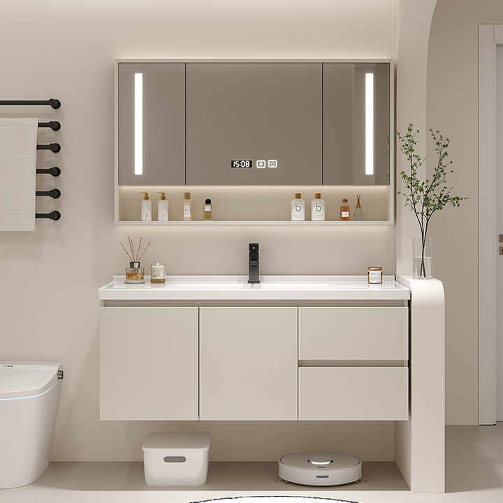 Meuble-lavabo mural moderne avec miroir LED intelligent, vasque flottante et étagères de rangement