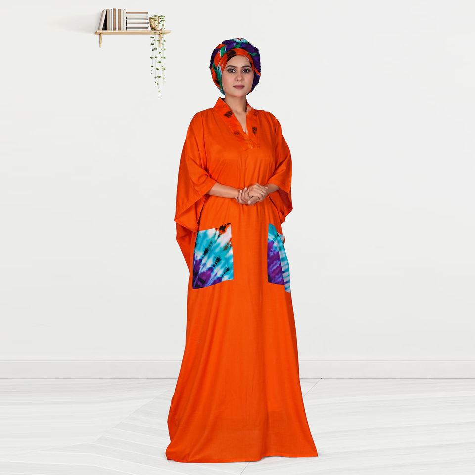 Kaftan modeste en rayonne avec accents imprimés contrastants, poches avant spacieuses, coupe maxi fluide et longue, tissu doux et respirant, idéal pour l'Aïd