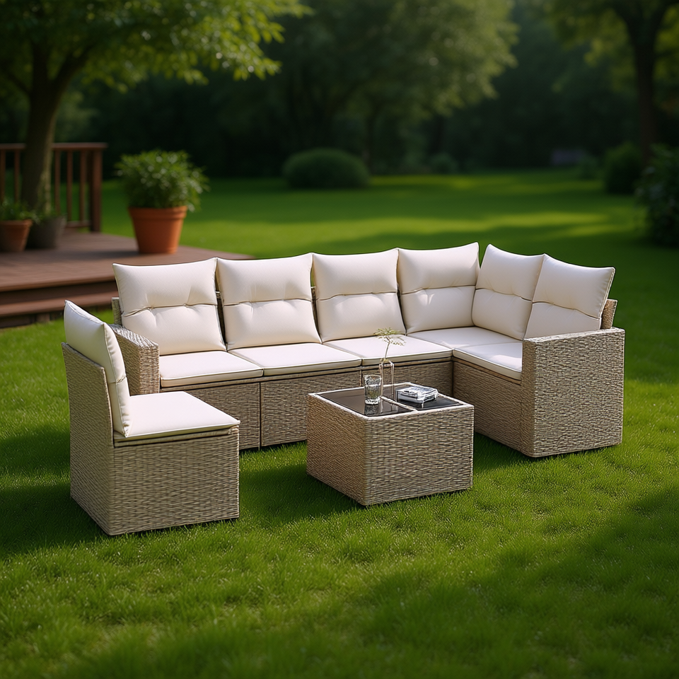 Ensemble de canapés de jardin modulaires en rotin PE beige 6 places, mobilier d'extérieur au design contemporain, résistant aux intempéries
