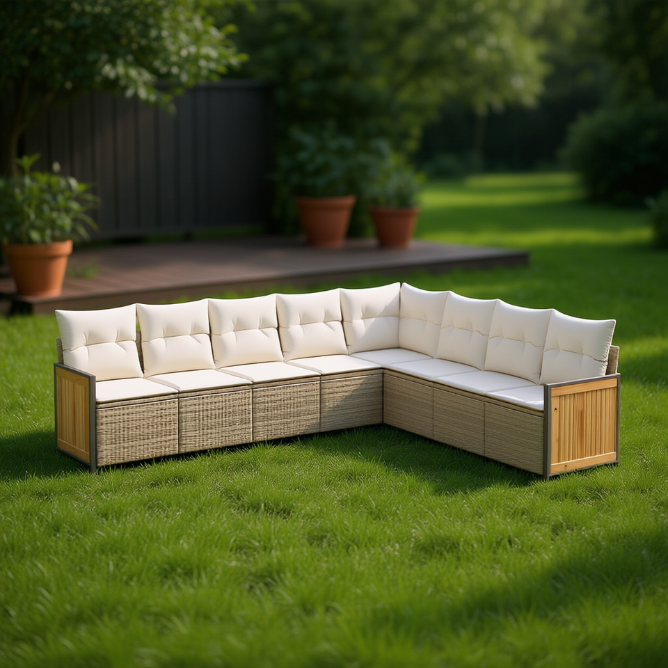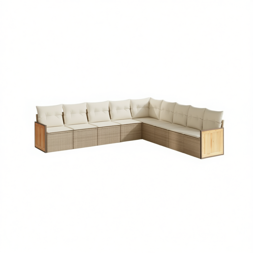 Ensemble de canapés de jardin modulaires en rotin beige, meubles d'extérieur confortables, design contemporain, coussin en mousse haute densité