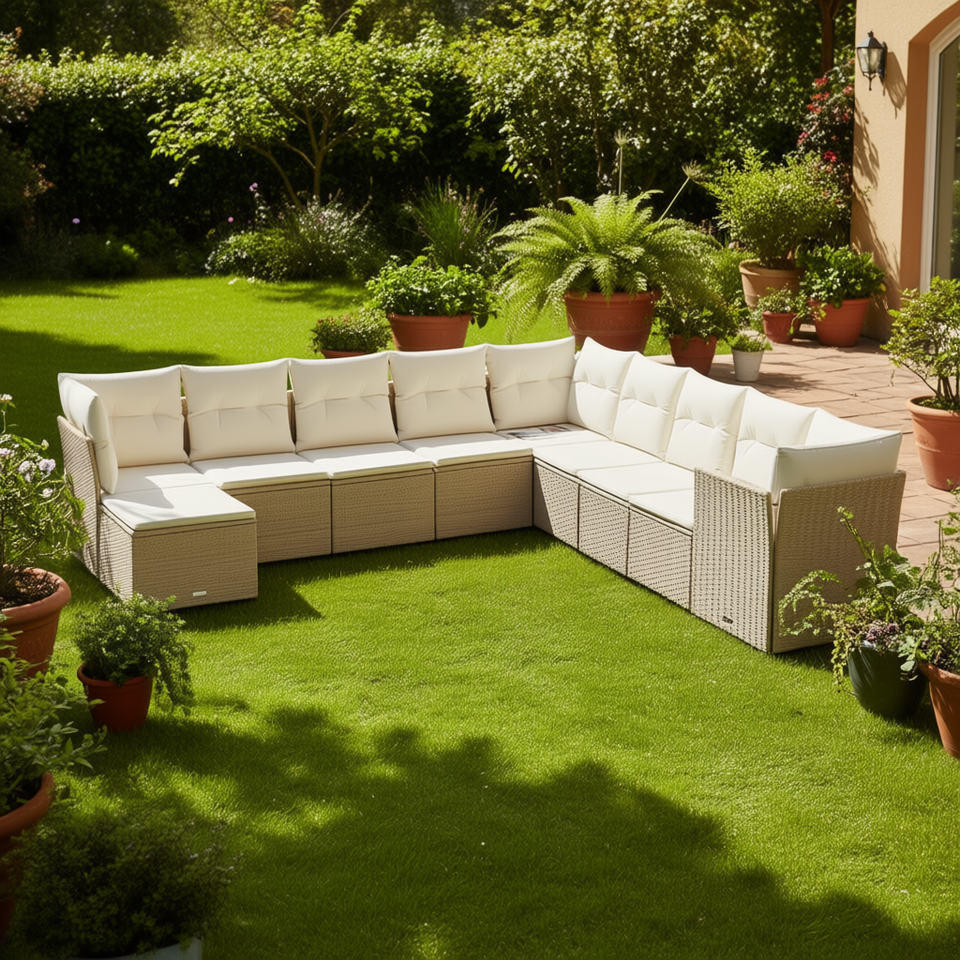 Ensemble de canapés de jardin modulaires en rotin beige, mobilier d'extérieur au design contemporain, coussins en mousse haute densité
