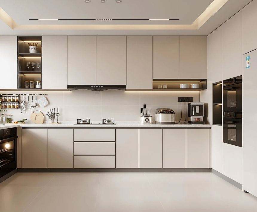 Armoires de cuisine modulaires en contreplaqué, finition mélamine, design imitation bois, évier inclus, style moderne, taille personnalisable