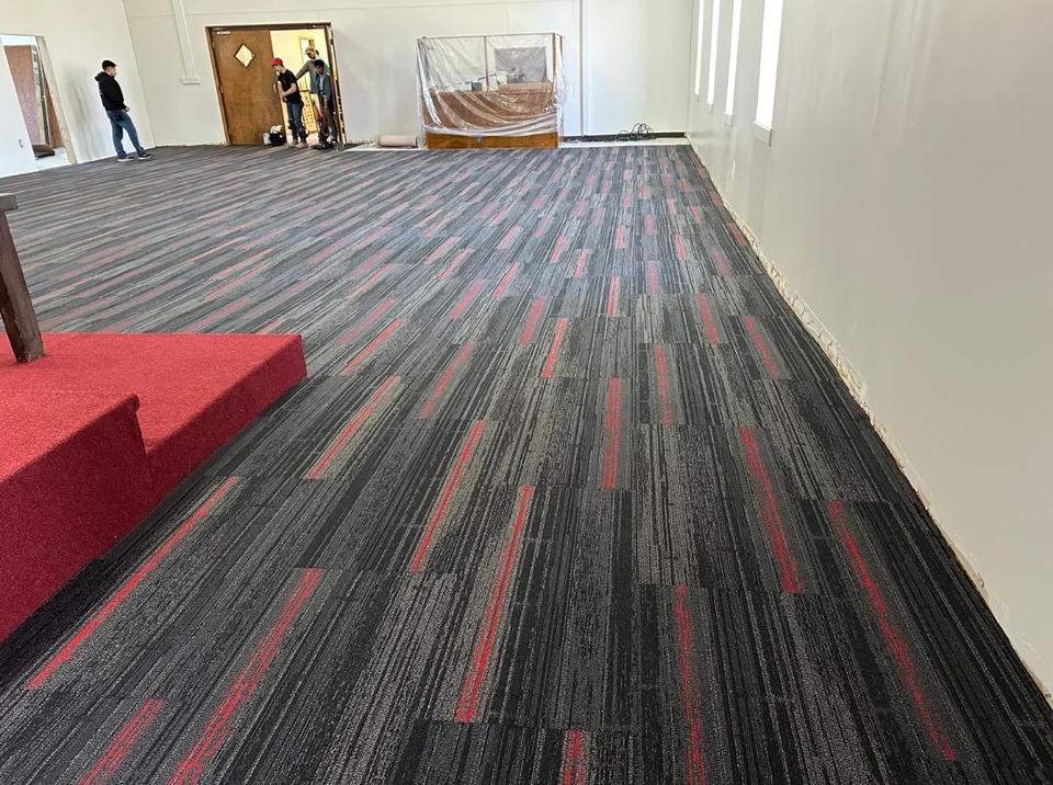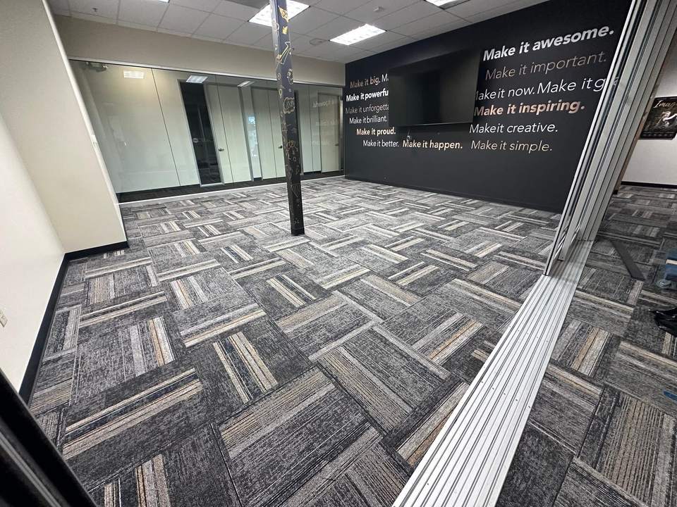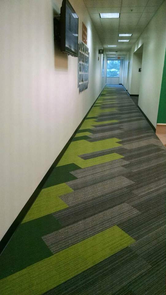 Dalles de moquette modulaires en polypropylène avec support en PVC pour zones commerciales à fort trafic.