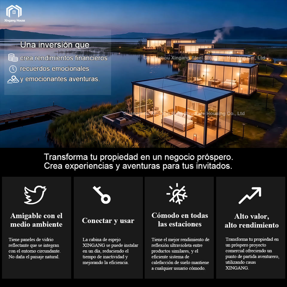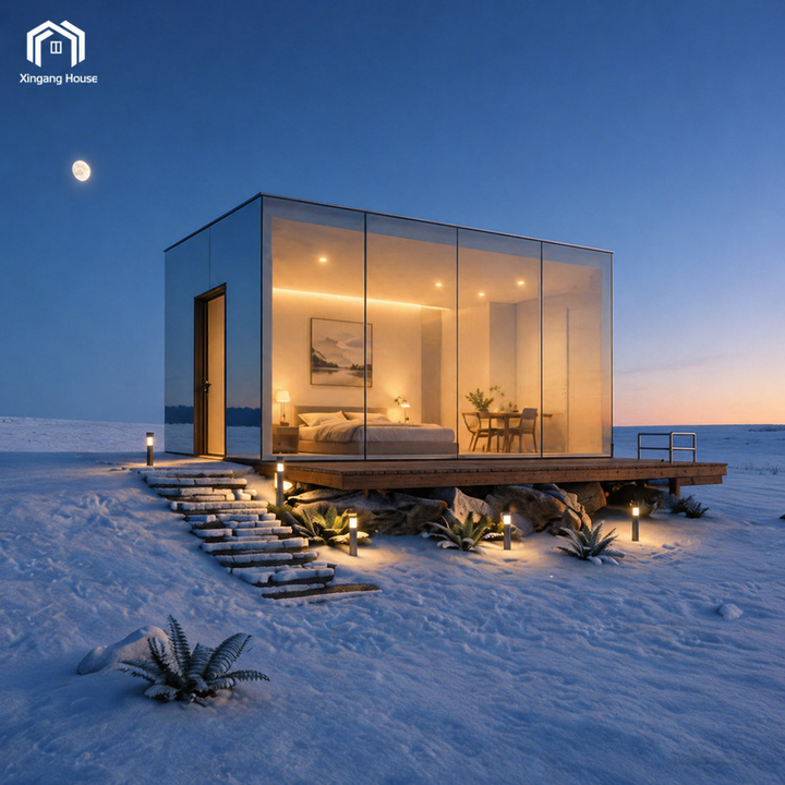 Maisonnette Modulaire Préfabriquée en Verre, 20 m², 1 Chambre, Alimentée à l'Énergie Solaire, Écologique, Appartement, Bureau, Hôtel, Cabine Miroir