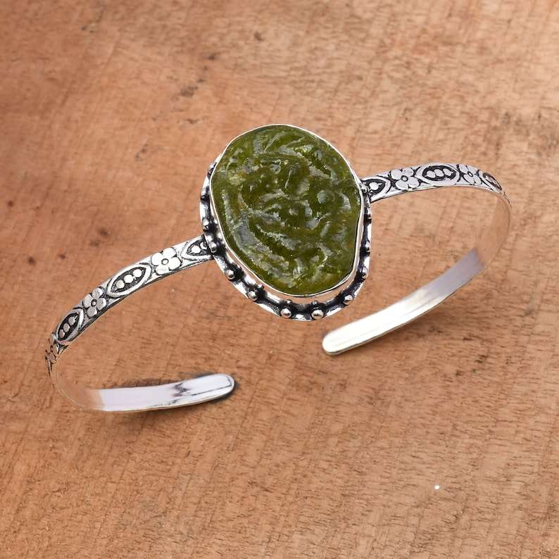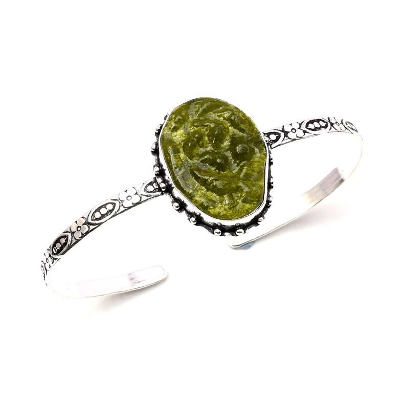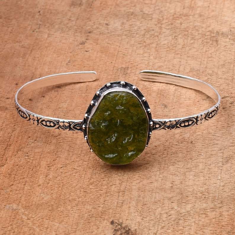 Bracelet manchette en argent sterling 925 fait main pour femme, avec Moldavite naturelle verte à effets optiques changeants – Cadeau idéal Nikhil Gems