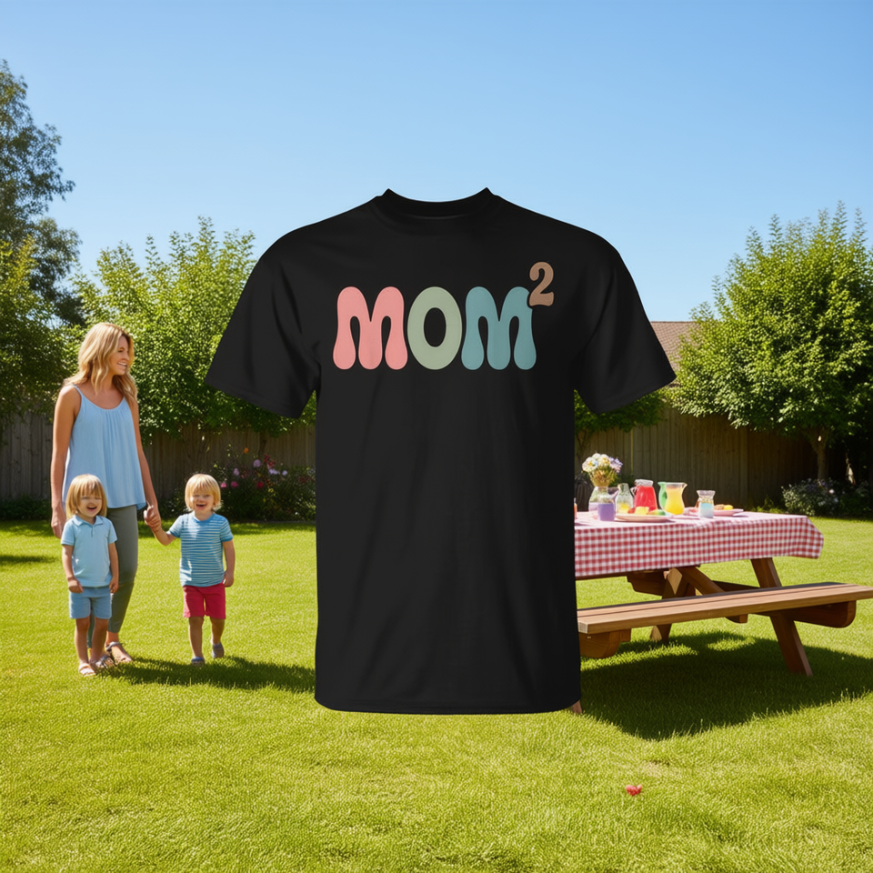 Mom2 Mom Squared Mother Of Two Twins Mama T-Shirt Short Sleeve Crew Neck Unisex Adult Family Reunion Party Wear