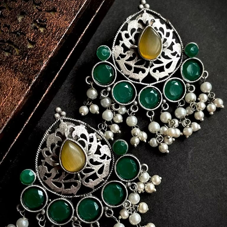 Monalisa Trendy Ethnic and Temple Jewellery Oxidized Stone Stud Earrings Beautiful Flower Brass studs for Women
