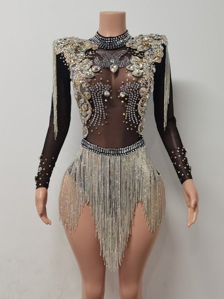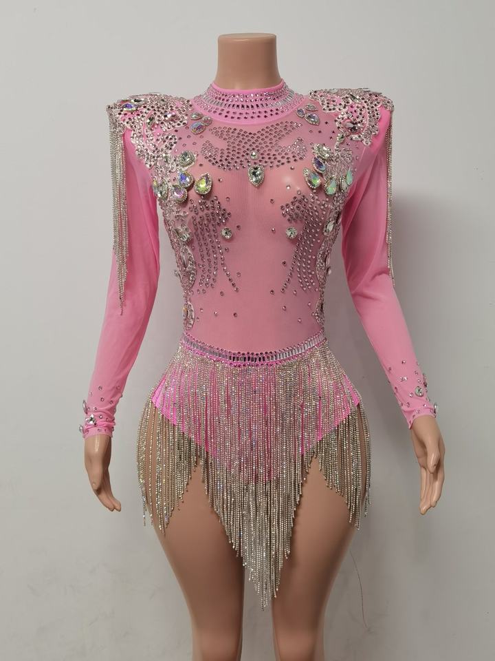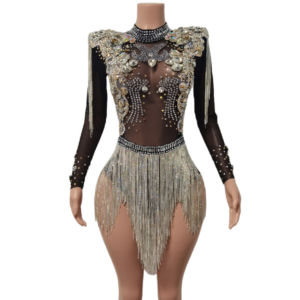 Monos Sexy Perspective Cristal Franges Combinaison Courte pour Femme Scène Performance Costume Night Club Justaucorps Strass Body