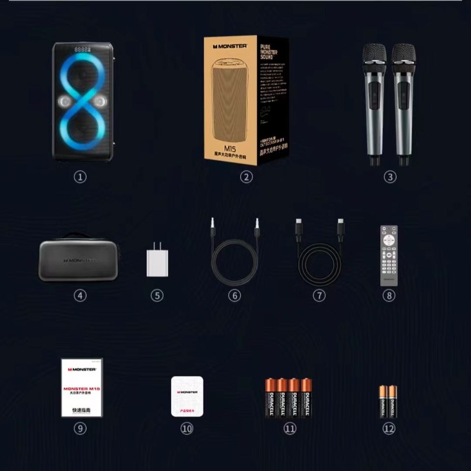 Monster M15 original pur son alimenté 6.5 pouces milieu de gamme bt5.3 smart led couleurs éblouissantes bleu clair dent boîte de fête haut-parleur