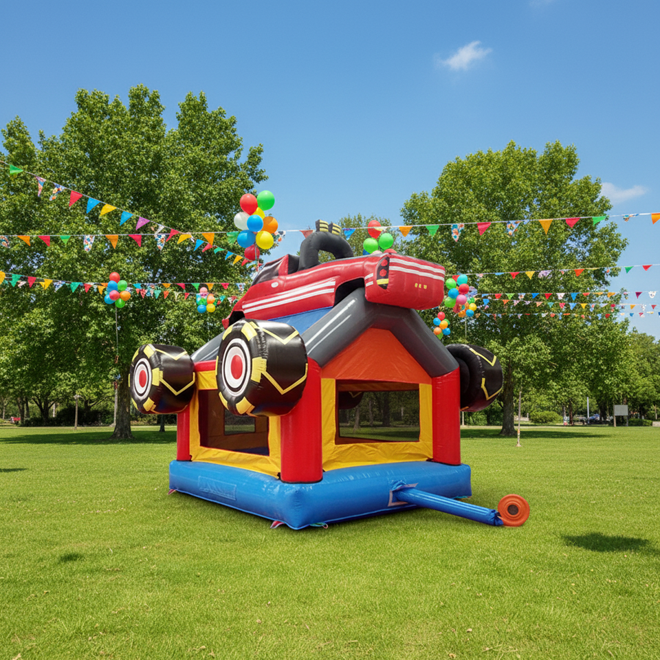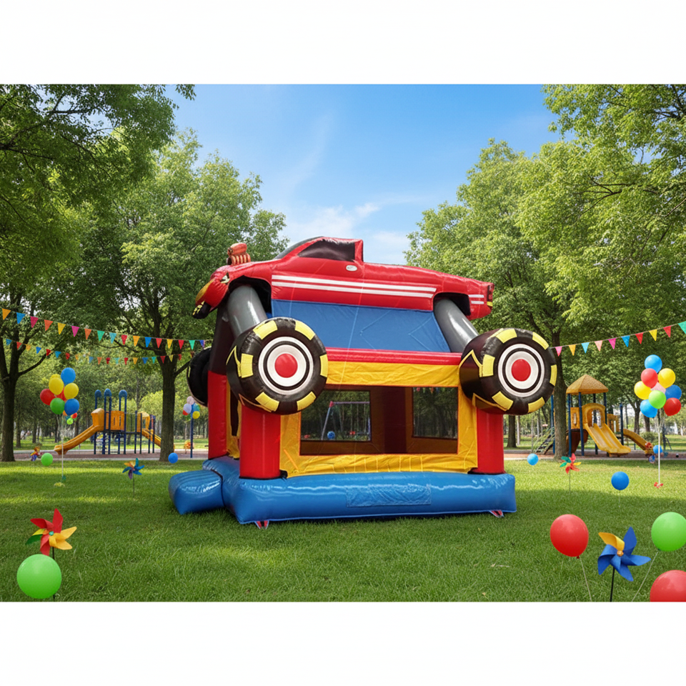 Château gonflable Monster Truck Rally avec roues jaunes vives et toboggan bleu pour les fêtes d'enfants en plein air et les divertissements en parc