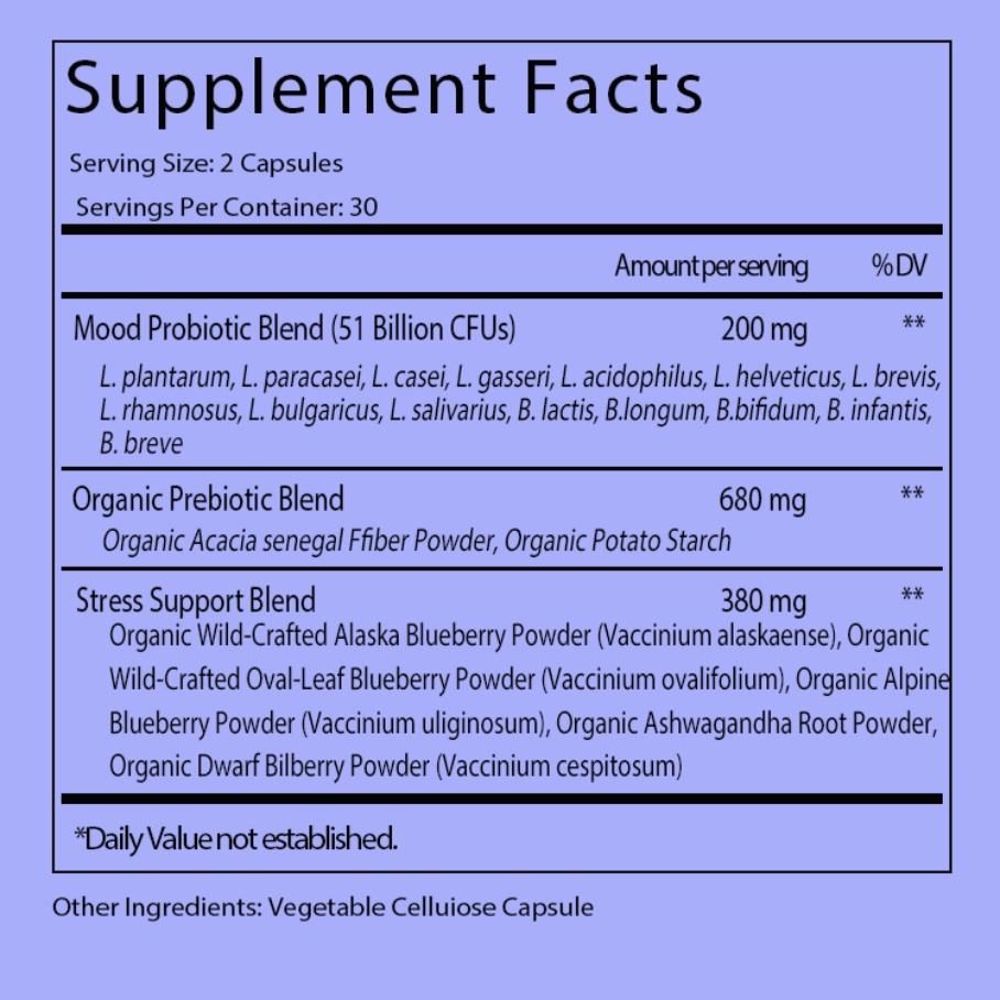 Ingrédient principal:Mood Probiotic Blend, Organic Prebiotic Blend, Stress Support Blend