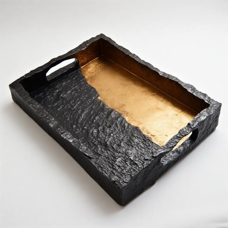 Plateau rectangulaire de luxe en fonte d'aluminium et en bois Moonlit Grace avec poignée d'accent pour les dîners et les occasions festives