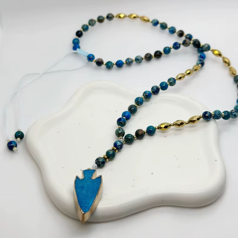 Moonriver Handmade Summer Essential Blue Natural Stone Bead Necklace Stainless Steel Peach Crystal Pendant Fashion Choker